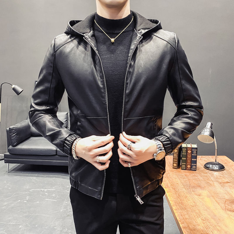 2023 Hooded Plus Fleece Biker Leather Jacket Men Fur Coat Motorcycle PU Casual