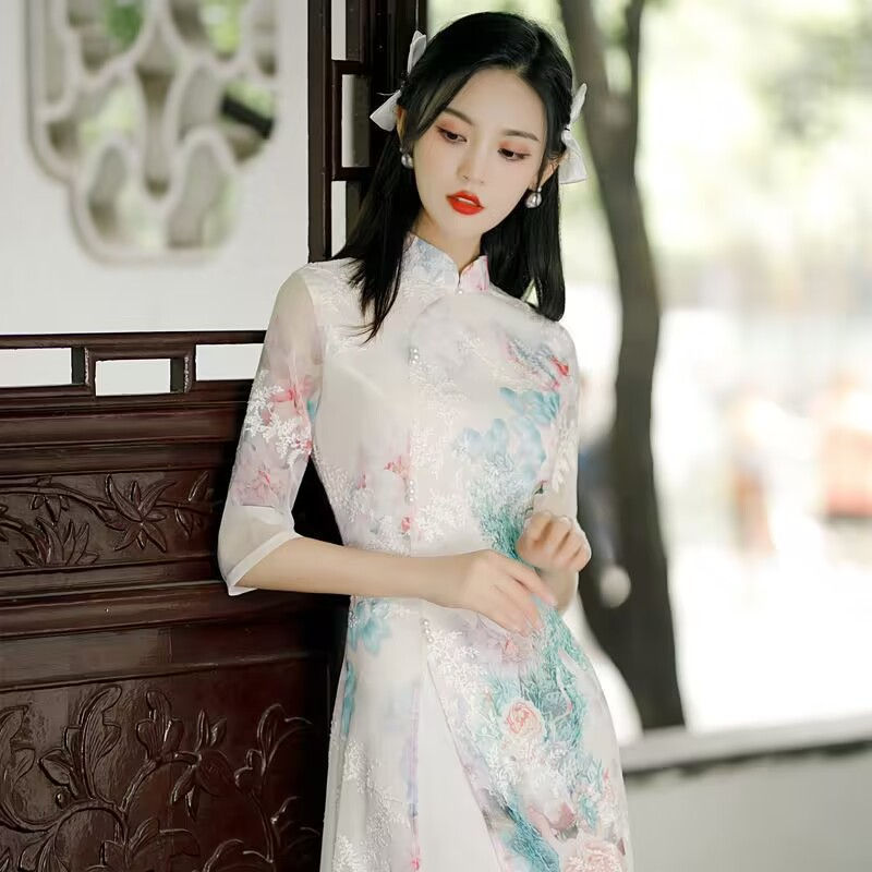 Summer Chiffon Ao Dai Elegant Dress Qipao Oriental Printing Dress Qipao Vietnam