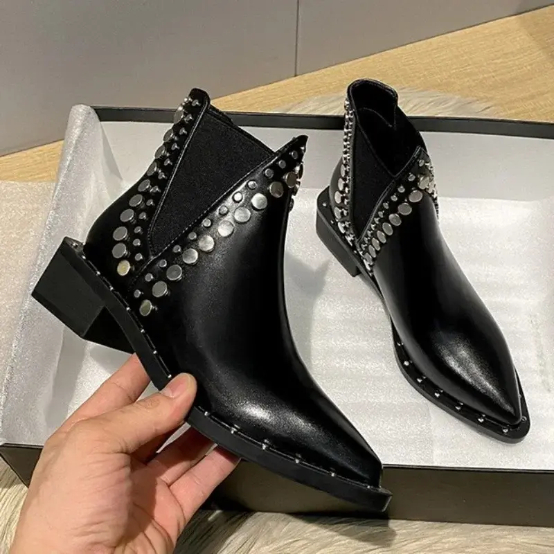 2024 New Womens Ankle Boots Sexy Pointed Toe Punk Style Rivet-decorated Women's